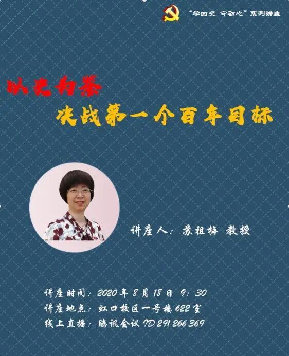 “两个一百年”的第一个一百年奋斗目标期限将近,以史鉴今、资政育人,重视从历史中汲取智慧和力量是中国共产党长期以来的优良传统。2020年8月18日上午,教工党支部书记苏祖梅教授为学院所有学生党员上了一堂题为“以史为鉴——决战第一个百年目标”的主题党课。全院近四十名党员师生线上线下共同参加了本次党课学习,组织部副部长刘燕老师也莅临了本次示范党课的现场给予指导。