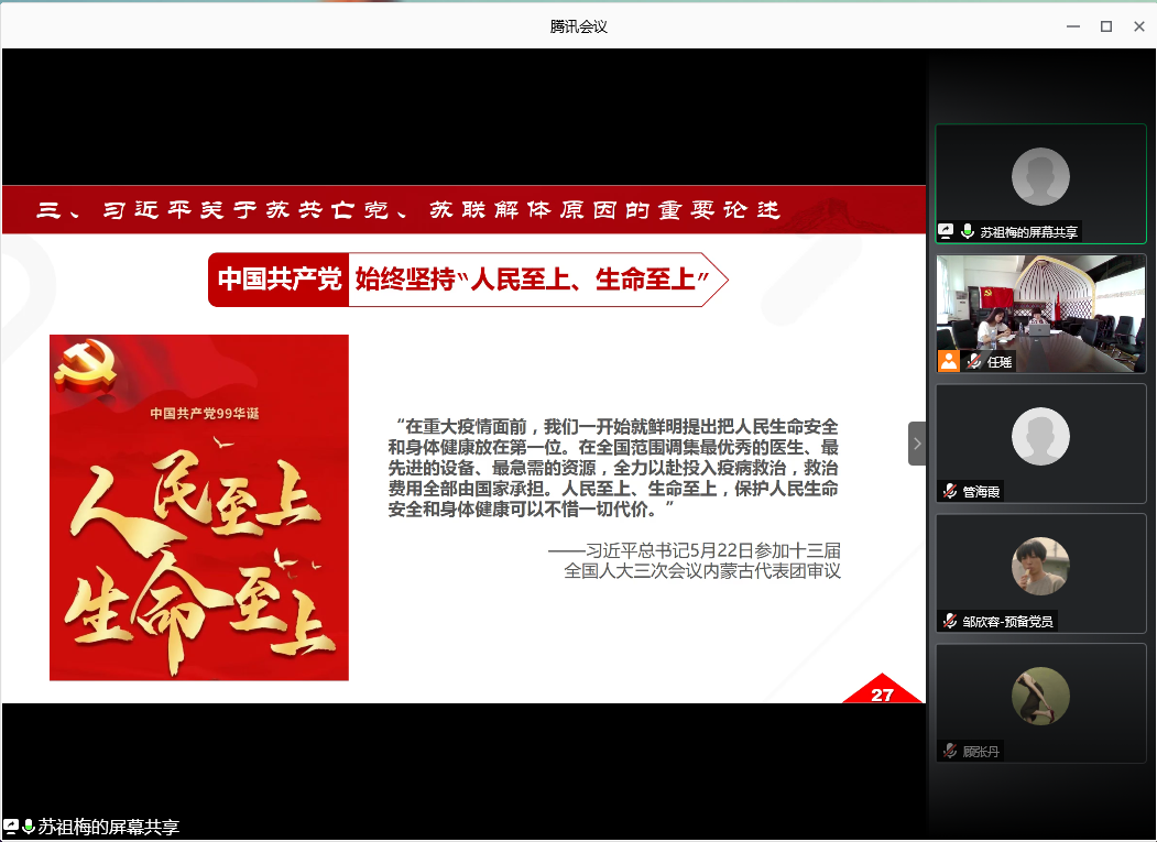 在决战第一个百年目标之际,苏祖梅教授带领党员们再次回顾了三十多年前在社会主义发展史上最重大的一场悲剧,苏共的亡党、苏联的解体让前苏联的共产党和人民付出了惨痛的代价。苏教授通过生动的史料充分剖析了苏共亡党、苏联解体的内因、外因,并结合习近平总书记与之相关的各类重要论述及讲话精神,阐述了“四史”教育的现实意义。当前我国正处在决胜全面建成小康社会,实现第一个百年目标的关键收官阶段,十八大以来,中国共产党始终保持住各项战略、工作、政策、措施的连续性和前瞻性,带领全国人民把新时代中国特色社会主义推向前进。党课最后,苏教授再次提醒党员青年们要牢记苏共亡党亡国的历史教训,常怀忧患意识;深入学习贯彻习近平新时代中国特色社会主义思想,紧密团结在以习近平同志为核心的党中央周围,坚定跟党走,增强“四个意识”;认真学习“四史”,坚定社会主义信仰,坚定马克思主义信仰,做共产主义事业的可靠接班人;要学法守法,懂得用法维护自身权益。在即将夺取全面建成小康社会伟大胜利,踏上实现第二个百年奋斗目标的新征程上,作为青年党员,要志存高远,同时又脚踏实地,练就过硬本领,在矢志奋斗中谱写新时代的青春之歌。