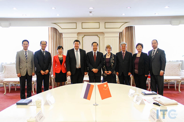 5月4日上午,俄罗斯科学院社会科学信息研究所代表团访问上海外国语大学。曹德明校长在凯旋厅会见了客人,双方就加强合作、共享信息等话题进行了交流,并签署合作协议。