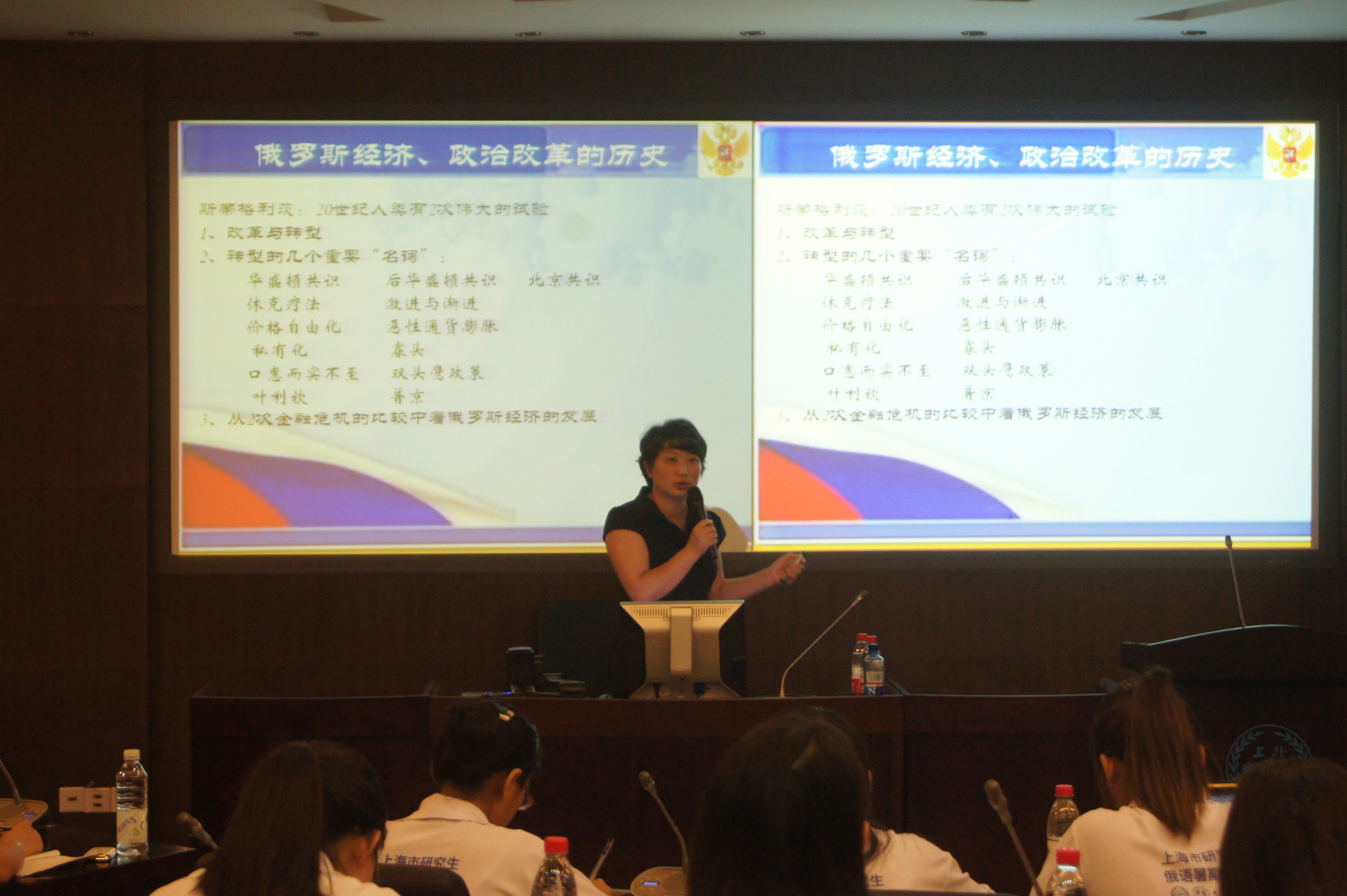 讲座是在上海外国语大学虹口校区第二报告厅举行的,由文化班班主任韦进深老师主持。讲座的题目为《普京与俄罗斯经济》,主要分为三个板块:俄罗斯的市场经济改革与转型、俄罗斯市场经济转型中的几个重要“名词”、从两次金融危机的比较中看俄罗斯经济的发展。