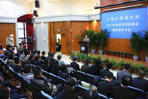 2013年12月17日下午,上海外国语大学2013年度教育奖励基金颁奖表彰大会在松江校区图文信息中心东厅隆重举行。上海外国语大学校长、校教育奖励基金评审委员会主任曹德明、校党委副书记李月松、副校长周承出席大会。颁奖大会由校教育发展基金会秘书长孟庆和主持。