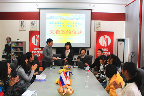 11月15日下午,由俄语系妇工委、团学联与江西乐平市塔前职业中学共同举办的“支教合作项目”签约仪式在俄语系俄语中心举行。俄语系党总支书记戴迪萍、妇委会主任蒋燕明、分团委书记庄孝林、团学联主席团成员与塔前职业中学中学师生一行11人参加了本次活动。
