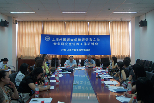 2013年俄语语言文学专业研究生培养工作研讨会于8月19日下午在我校举行。本次研讨会由我校俄语系主办,旨在探讨俄语语言文学研究生的培养方案及创新机制,切实推动研究生教育的改革与发展,搭建俄语语言文学专业研 究生培养交流平台,全面提高研究生的创新能力和培养质量。黑龙江大学校学术委员会人文艺术学部主任、俄罗斯语言文学与文化研究中心学术委员会主任张家骅, 俄罗斯语言文学与文化研究中心主任孙淑芳,北京外国语大学俄语学院副院长黄玫,黑龙江大学俄语学院副院长白文昌,苏州大学俄语系主任赵爱国,复旦大学俄语系主任姜宏,华东师范大学俄语系主任王亚民,上海外国语大学俄语系主任章自力、副系主任许宏以及上外俄语系研究生导师等20余人出席了本次研讨。研讨会由俄语系主任章自力主持。