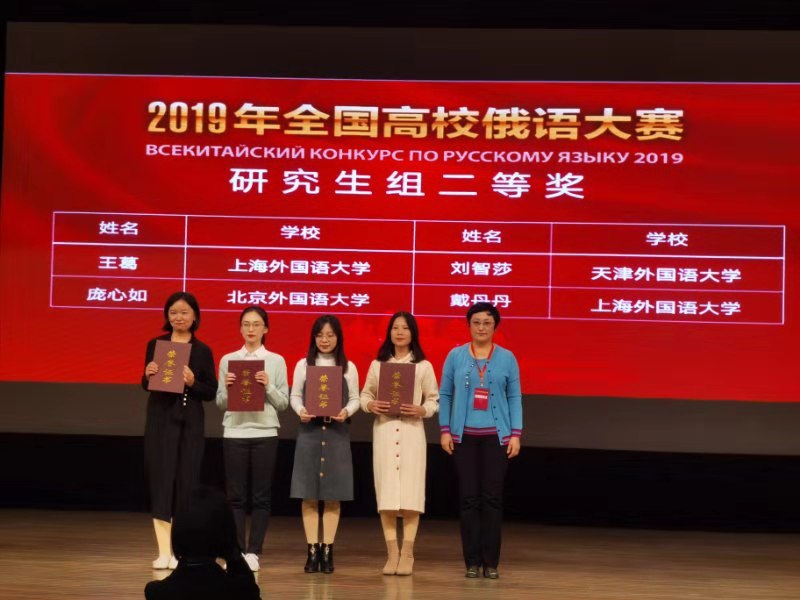 由中国教育部主办、北京外国语大学承办的2019年全国高校俄语大赛于10月27日晚在北京落下帷幕,我校俄罗斯东欧中亚学院王葛、戴丹丹双双荣获研究生组二等奖,总分名列全国第二、第五;钱书茗荣获高年级组演讲二等奖;在我院插班学习的中国石油大学克拉玛依校区的李鹏博获得低年级组三等奖。